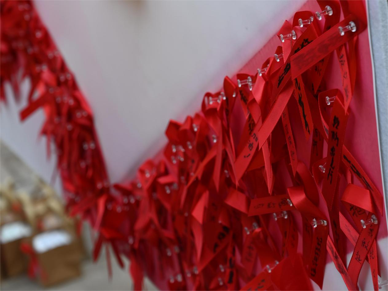 明信片带着红丝带,在校园里传递着艾滋病的相关知识,让同学们在寻找中牢记。原本观望的同学们,也拿起了笔,防住了“艾”,留下了一颗颗稚嫩而又坚定的心。树叶在一旁飒飒作响,空气中伴着清新草香。形式各样的拍照框在荷花池旁环绕,伴随着一份份有温度的名字与话语,在展板上迎风而起。精致的小礼品,用心的宣传册,热情的志愿者,引来了老师与同学们的驻足围观。