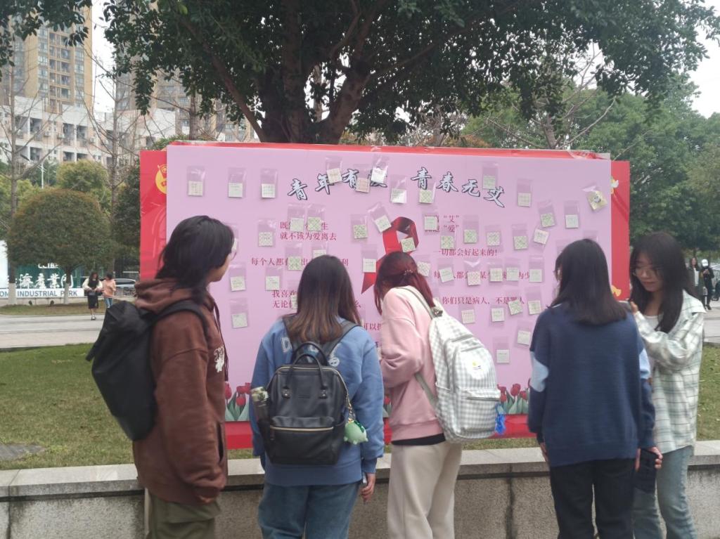 合川A校区本次线下打卡活动以“青春有爱,青年无艾”为主题,主要分为两个部分。首先是以寄语打卡的文字形式,志愿者统一介绍预防艾滋病知识后参与寄语打卡,打卡后可获得心仪防艾礼品一份;其次是小型特色KT板打卡点,围绕荷花池设立打卡点,大家更容易了解到本次活动,积极参与打卡。