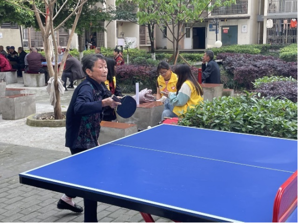“乒乓争霸”:青年志愿者和社区的爷爷奶奶开启了球拍上的较量,在一来一回的乒乓球之间,挥洒着激情的汗水,也凝结着老一辈人对青年的希冀,以及年轻一辈对老人的关怀。