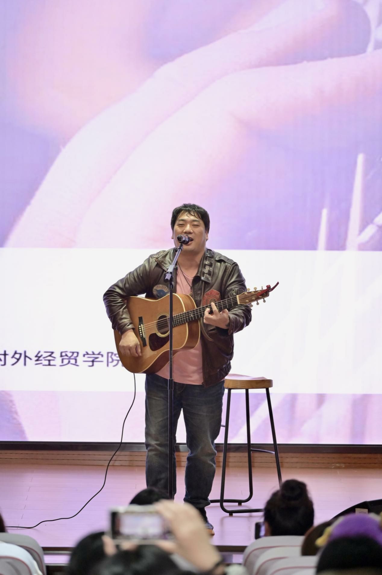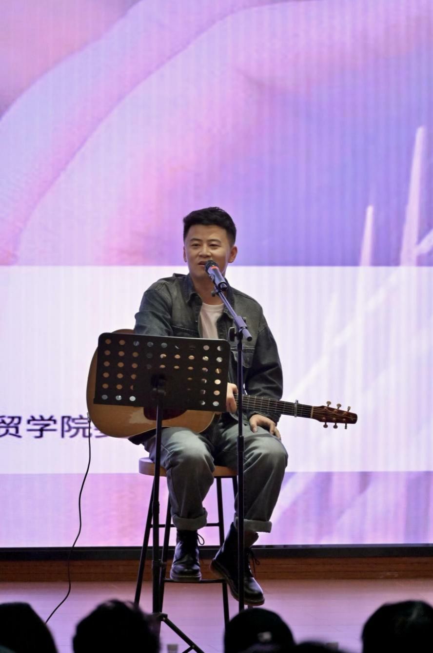 歌手汪明辉携一把吉他率先登台,温柔唱腔如晚风拂面,一首《成都》缓缓铺展开城市烟火里的细碎温柔,熟悉的旋律漫过耳畔,瞬间点燃全场共鸣,师生们轻声跟唱,让礼堂里满是青春的呢喃与回响;随后演绎的《鼓楼》,以细腻婉转的曲调,将对时光的眷恋、对故乡的牵挂娓娓道来,简洁的编曲搭配真挚的演唱,让每一份细腻心事都在旋律中落地,也让师生在忙碌的学习生活中,得以暂卸疲惫,在温柔旋律中治愈心灵、舒缓压力。当歌手老谢登台,全场掌声与欢呼声如期而至,沉稳醇厚的嗓音里,藏着岁月沉淀的温柔与坚守。《大冰的小屋》一开口,便将音乐路上的初心与热爱缓缓诉说,质朴的歌词里藏着青春最本真的模样,轻易叩响每一颗年轻的心,让同学们在歌声中读懂坚守的意义,汲取逐梦路上的勇气;《妈妈》以沙哑却滚烫的嗓音,诠释着亲情里的牵挂与柔软,字字句句皆有温度,让师生在感动中学会感恩、滋养心灵;《可可西里看海》则载着对远方的憧憬、对自由的向往,悠扬旋律在礼堂里流转,与汪明辉的温柔唱腔形成巧妙呼应,将现场氛围一点点推向高潮,掌声、欢呼声与旋律交织,酿成青春最动人的模样,也让大家在热爱中坚定信念,以更饱满的状态奔赴学习与生活。