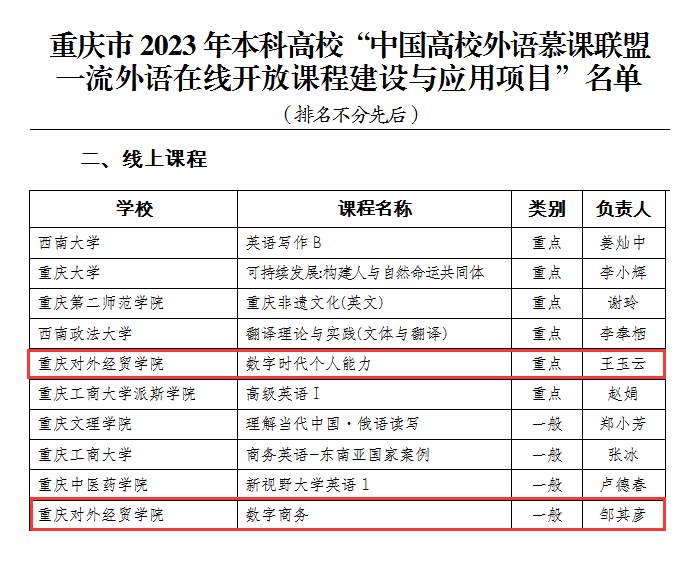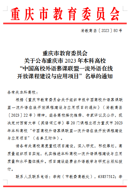 近日,重庆市教育委员会下发了《关于公布重庆市2023年本科高校“中国高校外语慕课联盟一流外语在线开放课程建设与应用项目”名单的通知》(渝教高函〔2023〕80号),全市共20门课程立项。学校外语外贸学院申报的线上课程《数字时代个人能力》《数字商务》成功获批并立项建设,其中《数字时代个人能力》被列为线上课程重点项目,这是36365官网在课程建设方面取得的又一重大突破。