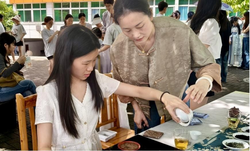 活动现场亮点频出。熊畅老师为活动现场题字,汉服社成员身姿绰约,进行汉服走秀;温纯老师悉心指导同学进行茶艺体验,展现“茶席美学”与“茶香墨韵两相宜”的意境,感受古人“茶禅一味”的智慧;渝派漆艺艺术馆展出了漆雕匠人结合现代设计理念创作的实用艺术品,美不胜收。
