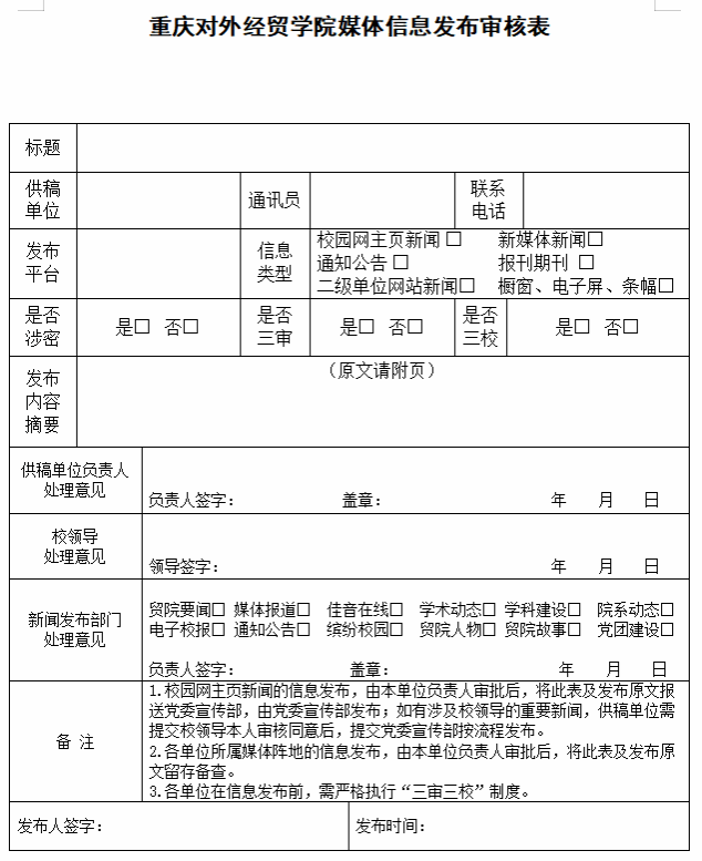 第九条 统一管理要求。各单位要进一步完善信息采编管理制度,用“一个标准、一把尺子、一条底线”统一严格管理所办报刊、网站、微博、微信、客户端、抖音等各类媒体及其采编人员;要严格执行“三审三校”制度,进一步规范采、编、发工作流程,建立信息消息来源核实核准机制,多方核实发布信息事实,确保信息报道真实、全面、客观、公正,各类信息需填写《媒体信息发布审核表》(附件)备案后发布;涉及校园网主页的新闻信息,需由各单位指定的通讯员起草或编辑,经该单位主要负责人审核后,报送党委宣传部;各单位如有涉及校领导的重要新闻,新闻供稿单位需提交校领导本人审核后,报送党委宣传部;宣传部宣传科收到指定通讯员报送的新闻稿均视作已按规定程序和要求执行。